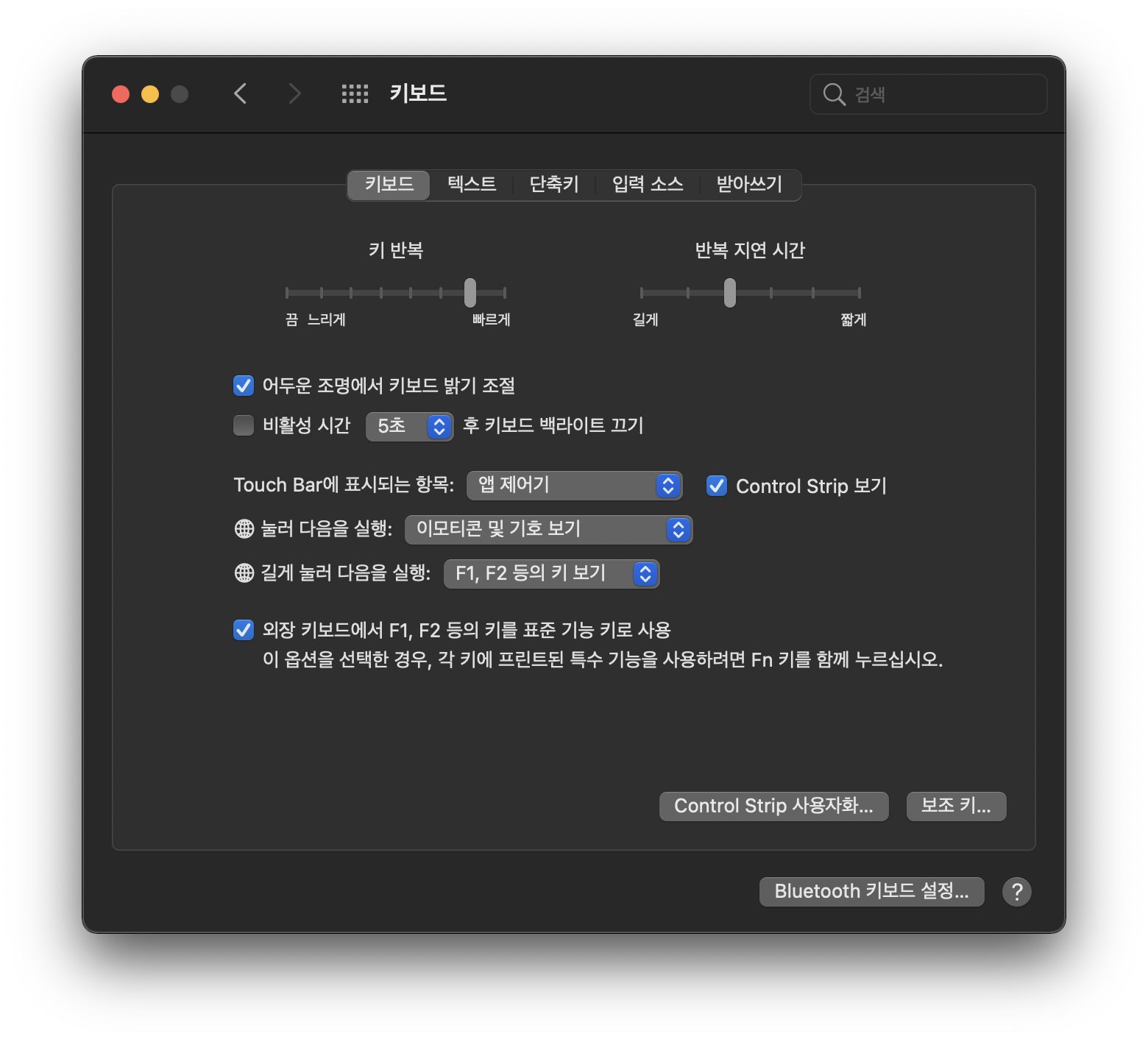 2) 키보드 - 외장 키보드에서 F1, F2 등의 키를 표준 기능 키로 사용 체크