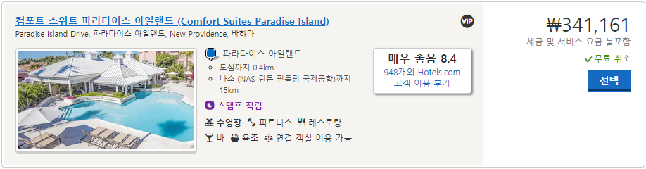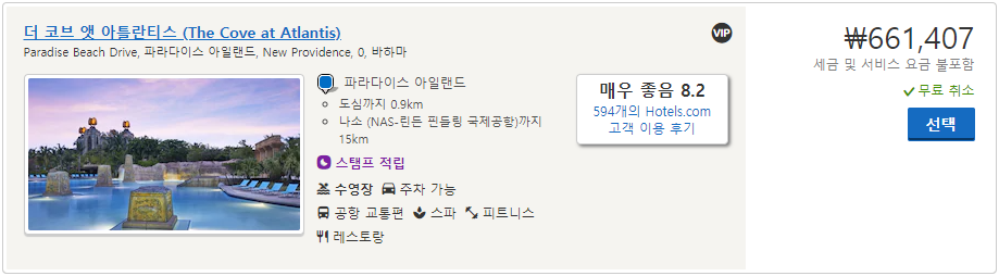 일단 엑수마섬에서 숙박은 포기했어도 당일치기로 다녀오려면 파라다이스 아일랜드에 숙소를 잡는 것이 편할 것이라고 생각했는데, 엑수마섬에서의 숙박 고민과 마찬가지로 관광을 목적으로 밖에 있다가 저녁에 들어가서 잠만 잘텐데 비싼돈을 내는 것이 아깝게 생각됐기에(심지어 아틀란티스는 밥도 돈을 주고 사먹어야 한다.. 바하마의 식대는 비싸기로 유명하다.) 아틀란티스를 포기하는 대신 지리적으로는 아틀란티스 바로 옆에 있으면서 제휴를 통해 아틀란티스의 시설을 무료로 이용할 수 있고, 조식이 포함된 컴포트 스위트에서 2박을 하며 보트를 타고 관광을 하기로 했다.