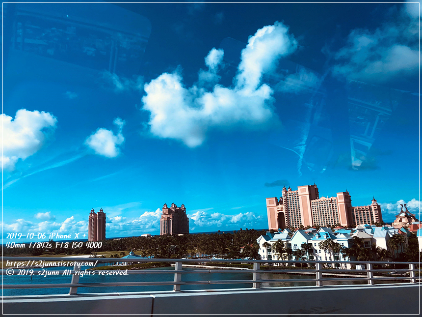 | 공항에서 유심을 산 뒤(SIM Card $11 + 7일 무제한 데이터 요금제 $35 = $46) 택시를 타고 파라다이스 섬(Paradise Island, Bahamas)으로 이동(택시비 $45 + 팁 $5 = $50) 다행스럽게도 이쪽 지역은 허리케인 도리안의 영향이 크지 않았나보다. |